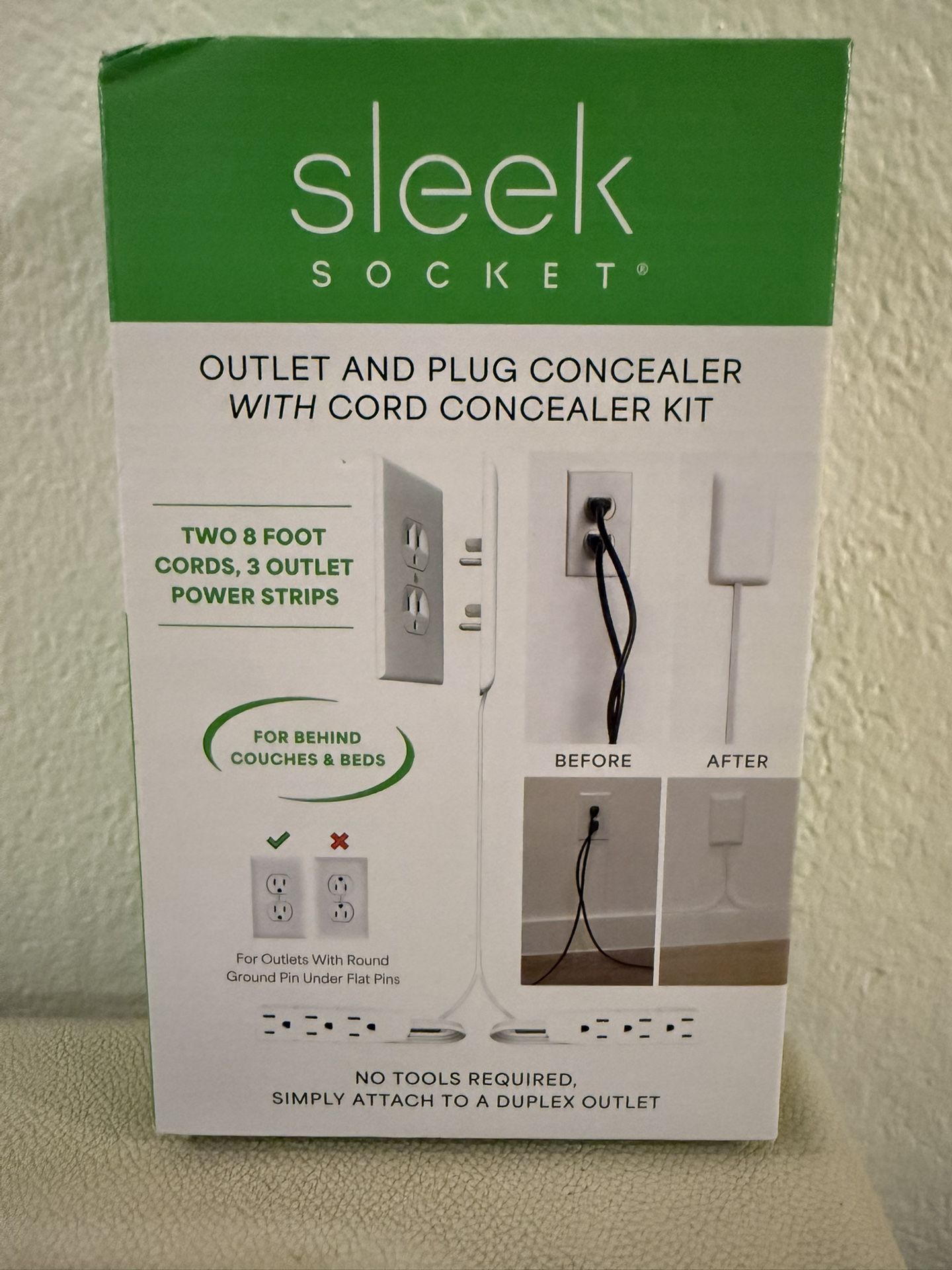 sleek SOCKET® OUTLET AND PLUG CONCEALER WITH CORD CONCEALER KIT TWO 8 FOOT CORDS, 3 OUTLET POWER STRIPS FOR BEHIND COUCHES & BEDS NO TOOLS REQUIRED, SIMPLY ATTACH TO A DUPLEX OUTLET