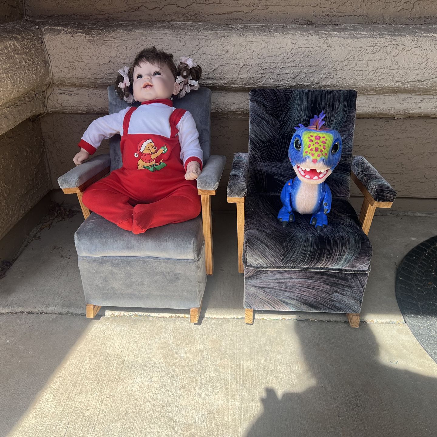 Charming vintage child-size upholstered rocking chairs. These were previously used by my grandmother to display her collection of porcelain dolls. Chairs only – decorative items shown in photos are not included. 💲 $20 for both Please note: • The black chair has a soft seat with a noticeable indentation (it caves in slightly when sitting). • The porcelain doll and dinosaur shown in photos are NOT for sale. • No delivery or shipping available. Local pickup only. • I will meet interested buyers at a local grocery store near me for pickup. Message me if interested!