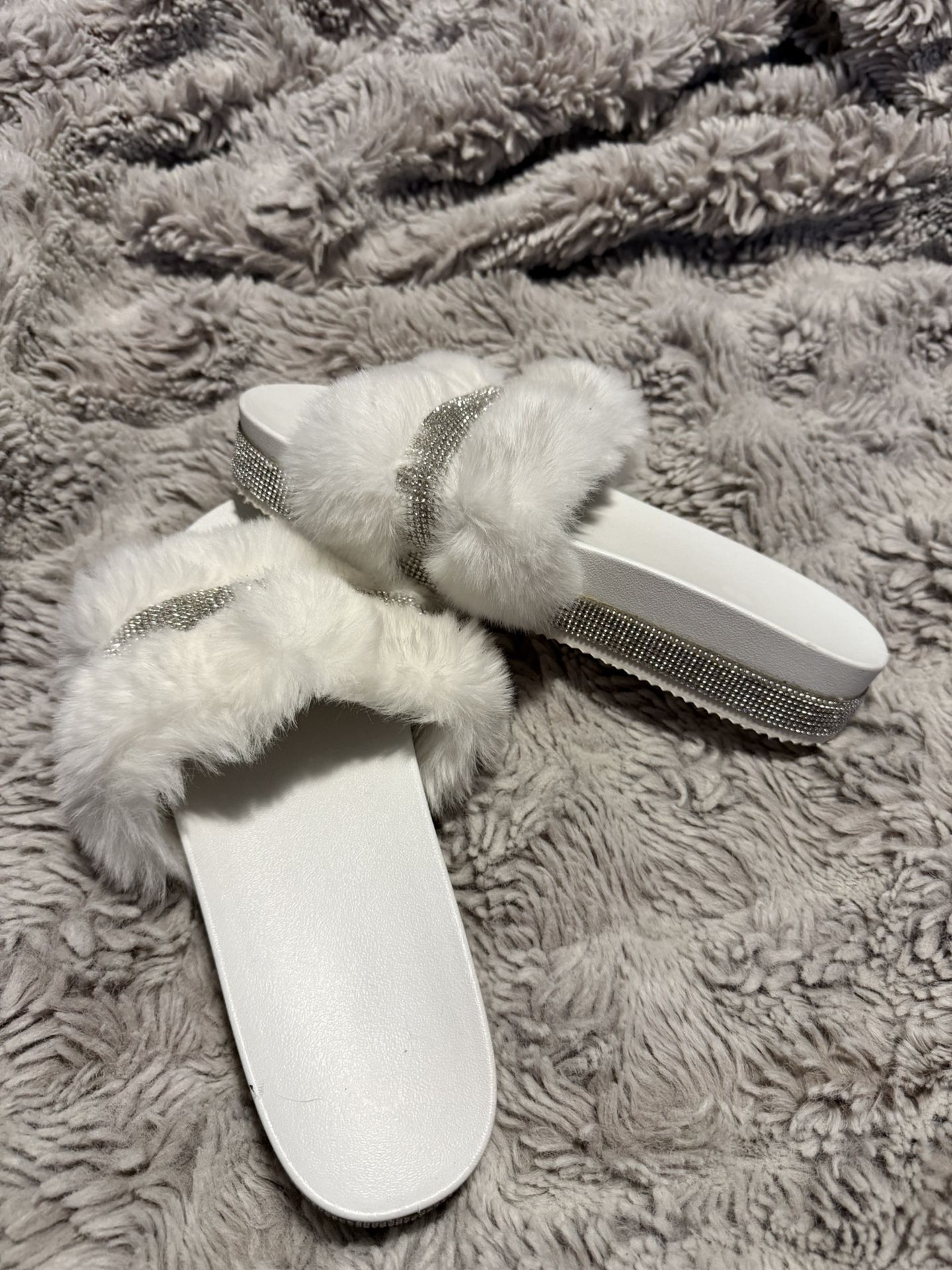 Fluffy white rhinestone slippers ✨ Size 9. Never worn, perfect for a bridal event, bachelorette, or cozy lounging. Bought originally from a seller on Etsy.