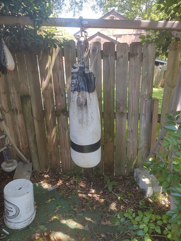 Used outdoor heavy bag and chains. Slightly weathered. Stand not included.