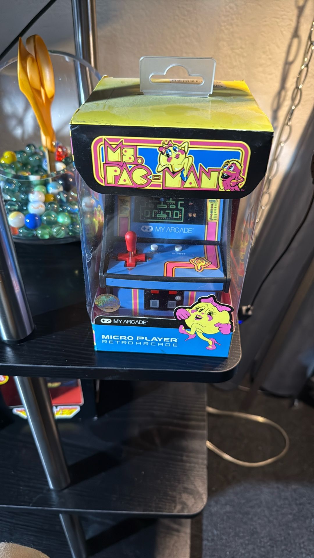 New in sealed box 25 with bonus defender mini arcade this unit had a factory defect has dead pixel line that has no repair the screen is permanent to board so I could not fix so it’s a gift with the ms Pac-Man