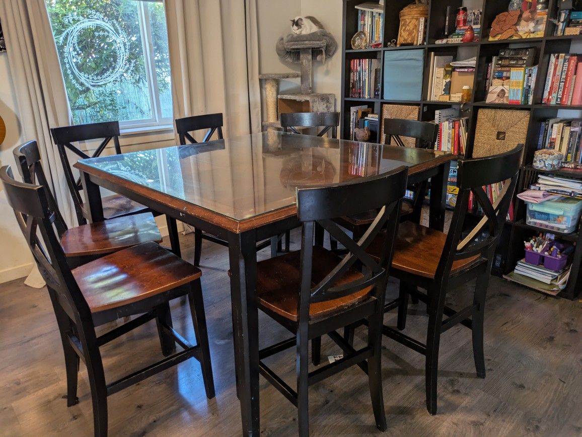 Large dining room table. Seats. Eight. Bar height. Has a leaf installed. Custom piece of glass to cover the top with the leaf in. Some typical wear and tear.