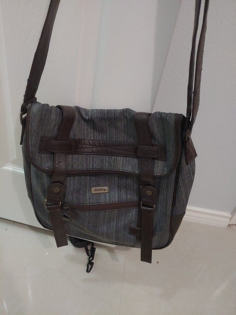 This is a beautiful Oakley messenger bag with a plaid Gray design. It is in good condition and will fit all of your needs.