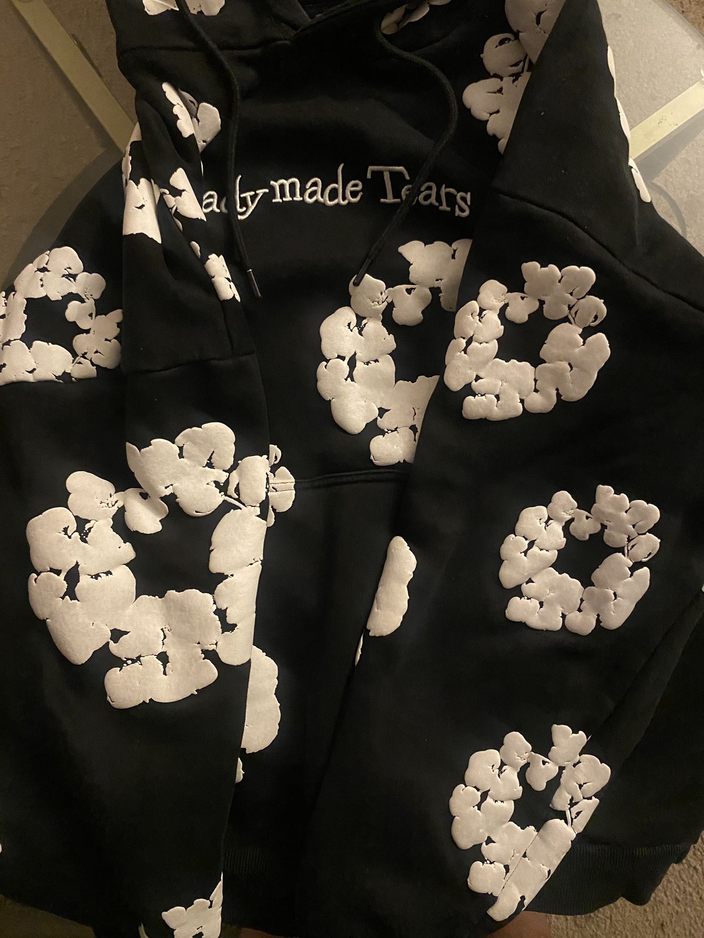 Denims tears hoodie (ready made tears) version size xl run a little big but I washed nd dryed it too shrink it ah bit