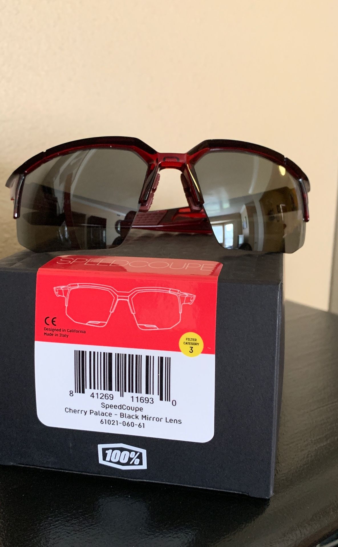 Brand new 100% Cherry color. Black mirror lens with zip up hard case and extra set of clear lenses. Style name is Speedcoupe. Brand name is 100%