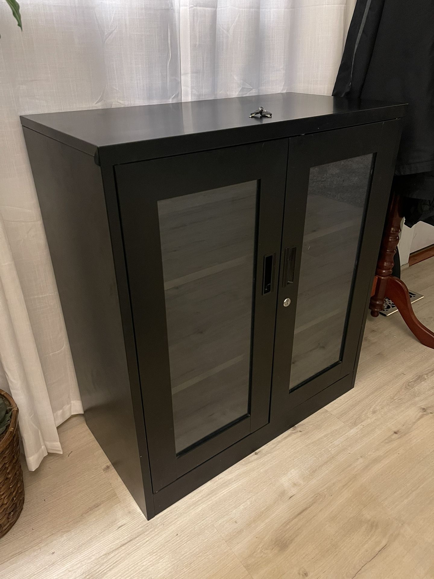 Sturdy black metal cabinet with windowed doors. Could be used as a liquor or tool cabinet. Comes with two keys. I was using it as an entertainment center. I added magnets to the doors so they stay closed independently and when unlocked. Also added four holes for passing cables through in the back and a series of vent holes in the top for components that warm up. 35.5”T x 31.5”W x 16”D