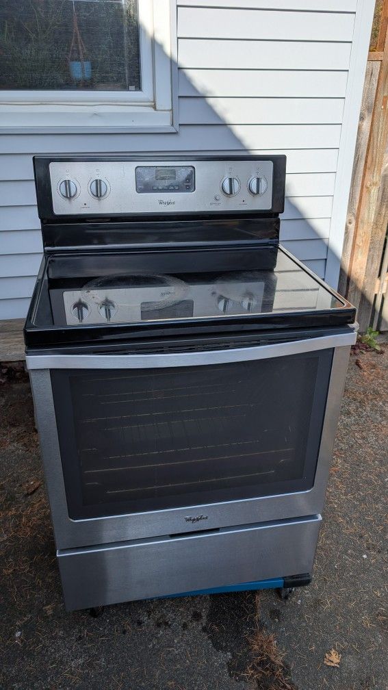 Used Whirlpool Electric Range for sale. Remodeled our kitchen and replaced it with an induction model. Glass top is a little stained, but no cracks. Has bake, convection, and broil settings. Does not come with electric cord.