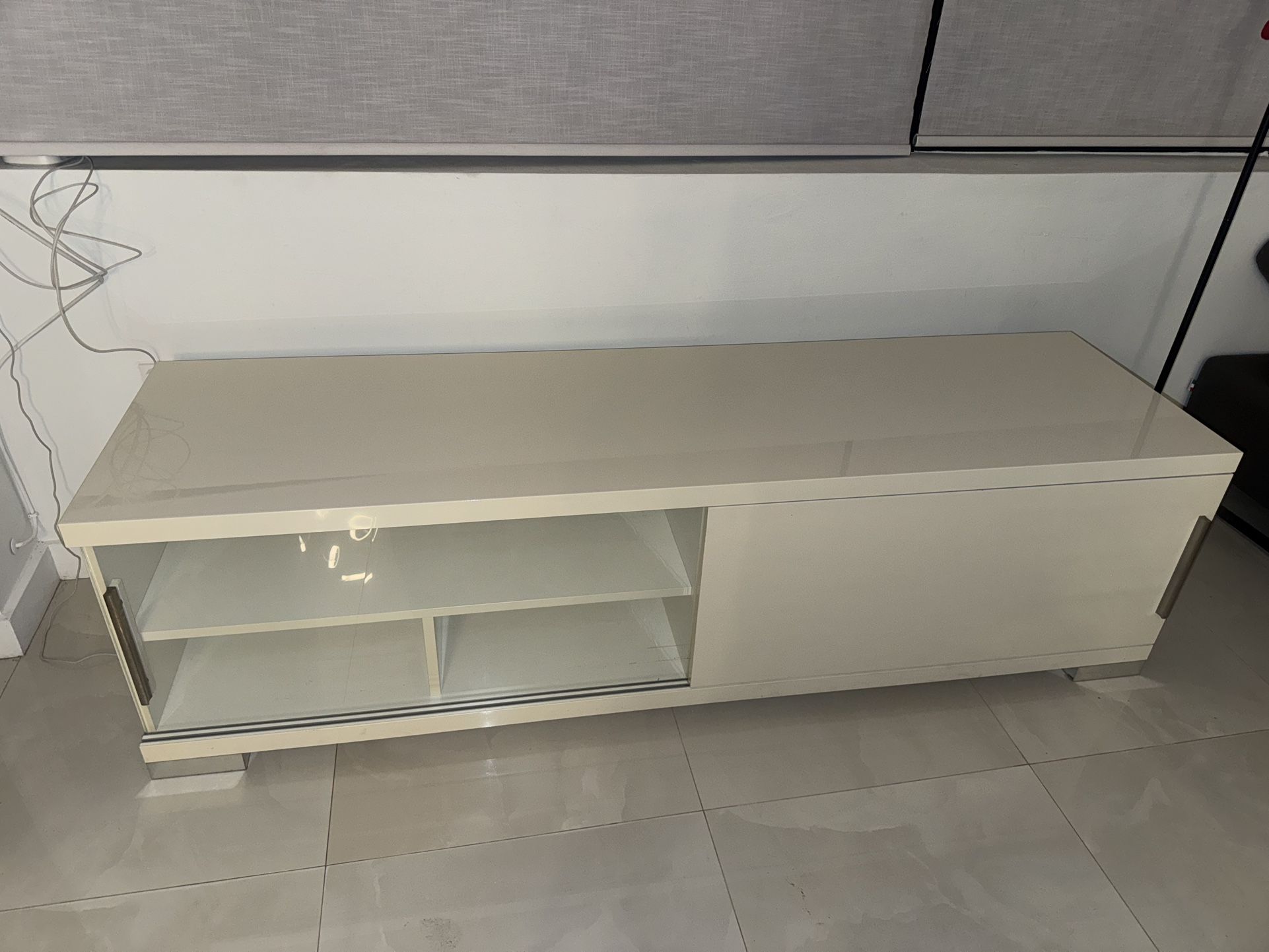 Sleek TV stand. White glossy finish. Has sliding door on both sides and 1 side with a glass door. Great for living room or bedroom setup. Dimensions: 21” height 20” wide 73” long