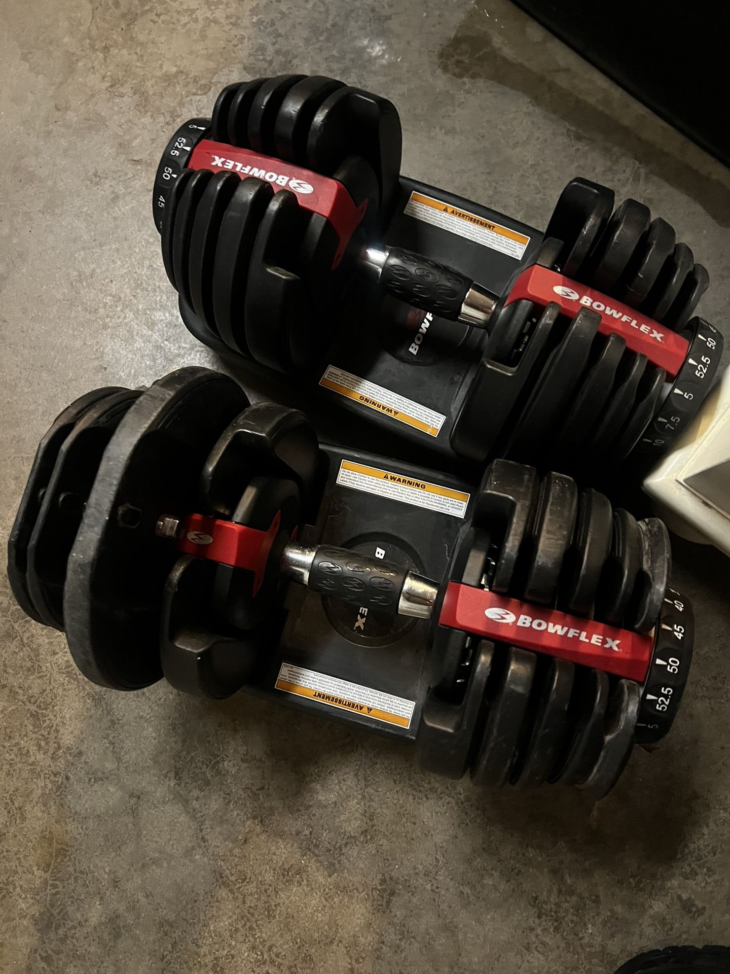 Bowflex dumbbells just dusty from sitting in storage Goes lowest weight 5 lbs and adjusts all the way up to 52.5 lbs