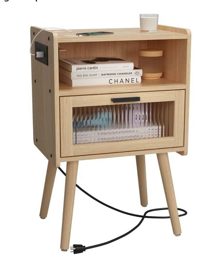 Mid Century Modern Nightstand with Charging Station, Bedside Tables with Glass Drawer, End Table Side Table with 2 Tiers Storage Space, for Bedroom, L