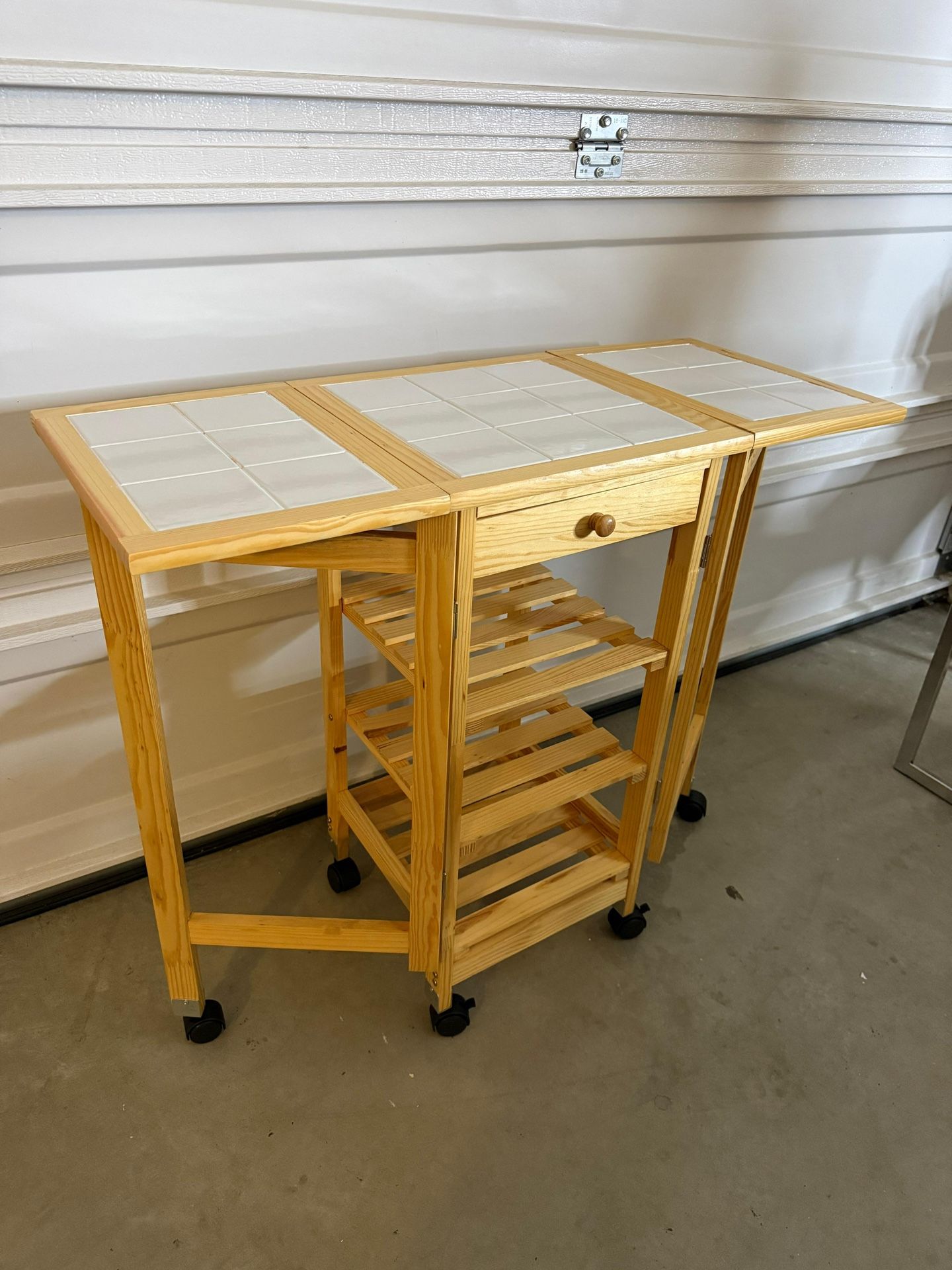 This is new! Already assembled RETAIL $99 SamyoHome Kitchen Island on Wheels Portable Folding Storage Trolley Cart with Drawer Small Rolling Dining Table Compared to wood tabletop, ceramic tile tabletop is easy to keep clean. With proper care, it will always shine like a brand new one. The pine wood is one of the best solid wood material to make table. It has natural color and texture. As one of the best wood, it is not easily deformed even use for years. You will like the quality if you are searching for a durable Trolley Cart. We use six casters for this trolley cart to flexibly moving, the casters are not easily to get stuck. You will use it more comfortably. Two side panels can be fold out to be used as extra serving space to place your dinning sets. When you don't need it, you can fold it to save space. Material: Ceramic Slate & Pine Wood Frame Dimension: (35.8 x 14.6 x 29.52)" (L x W x H) Desktop Thickness: 0.59" Leg Size: (1.38 x 0.59) (L x W) Drawer Size: (11.4 x 11 x 2.4) (W x D x H) Wheel Dia.: 1.9" Ground Clearance: 3.7" Color: Brown