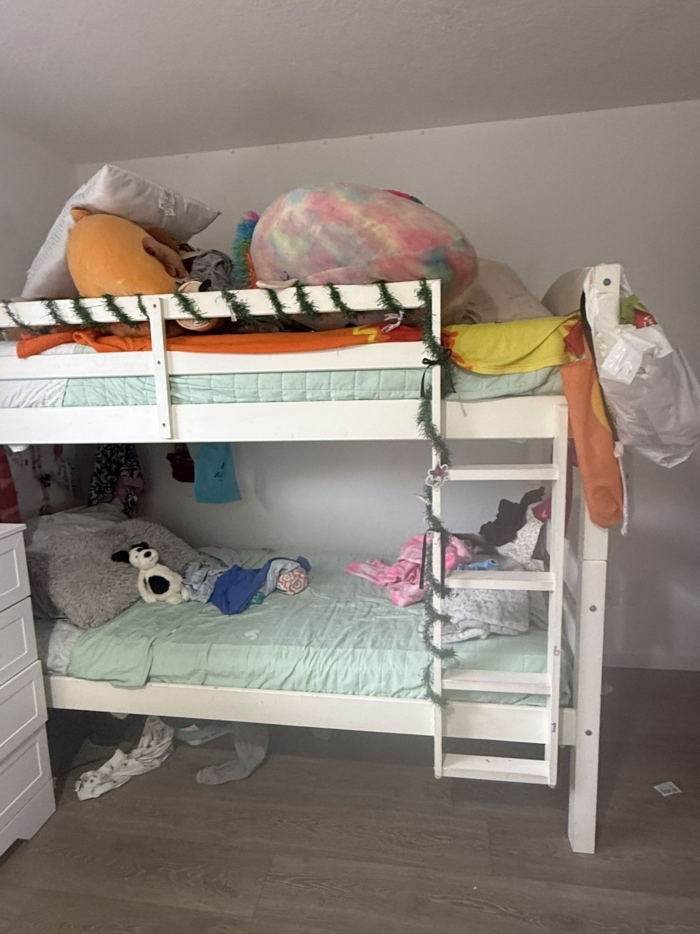 Bunk bed with used mattresses. Used. Looking to get rid of as soon as possible. Damage to bed as seen in photos mattresses included selling with bed frame.