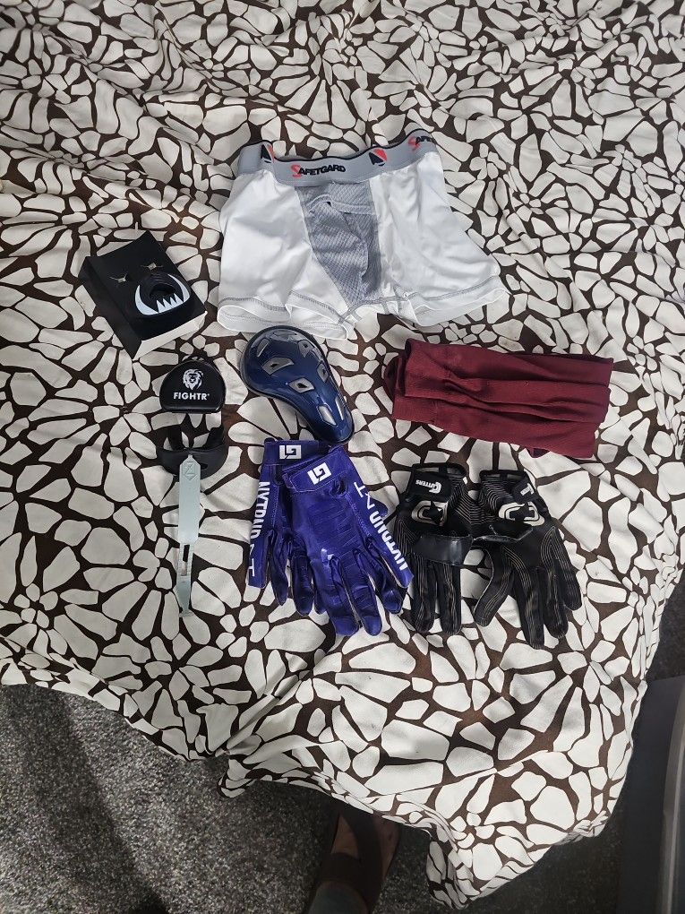 Boxers with cup, socks, 2 mouth guards, 2 pairs of gloves. Some things new, some used in good condition.