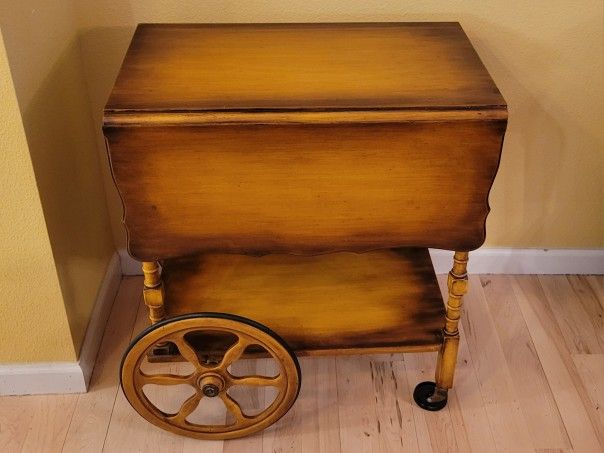 Has a pull out glass tray. No damage. Dimensions: 38" x 26" when extended 17 x 26 folded down. Height is 29" Antique, mid century