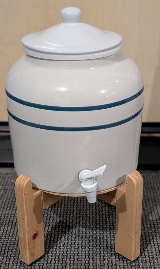 Ceramic water dispenser with green color lines and wooden stand. Was used for artesian water.