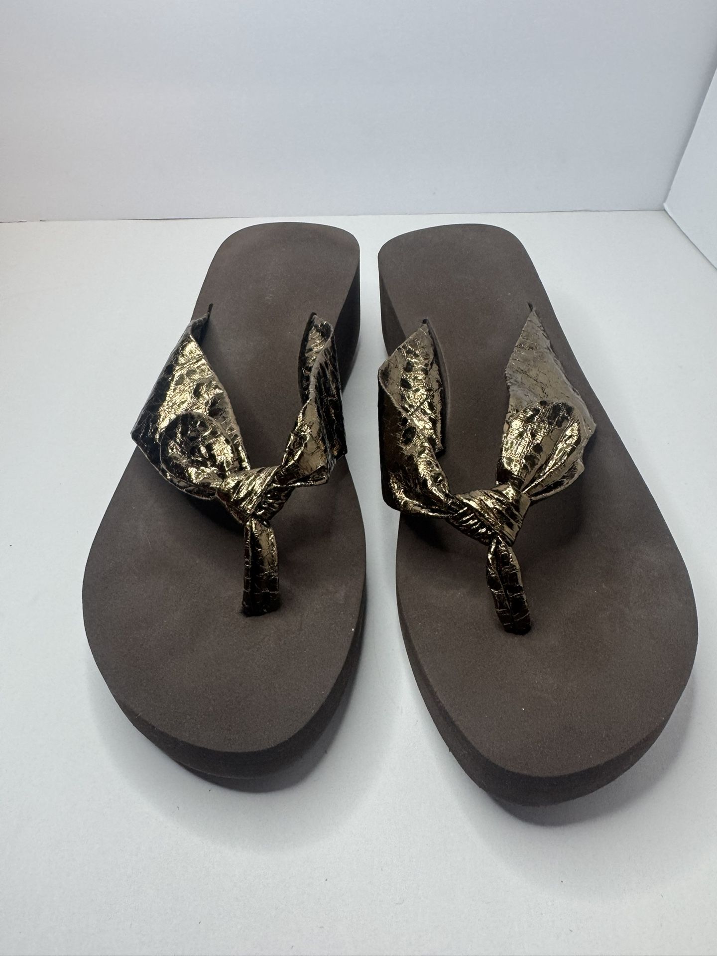 Margaret J by Margaret Jerrold “Balloons” Platform Wedge Flip Flop Sandals — Size 9.5N — Oyster Metalics Step into vintage-chic style with these platform wedge thong sandals by Margaret J (Margaret Jerrold), style name “Balloons” in the colorway Oyster Metalics. Details: ∙ Size: 9.5 Narrow (9.5N) ∙ Style: Thong/flip flop with knotted bow detail at the vamp ∙ Upper: Metallic gold/bronze crinkled reptile-embossed material ∙ Footbed: Smooth brown cushioned footbed ∙ Platform: Chunky brown wedge, approximately 1.5–2 inches at the heel ∙ Outsole: Brown rubber with “Reaction” branding for traction ∙ Brand: Kenneth Cole Reaction sub-brand (Margaret J line) Condition: Pre-loved. No noticeable flaws or defects. Please review all photos carefully — WYSIWYG.
