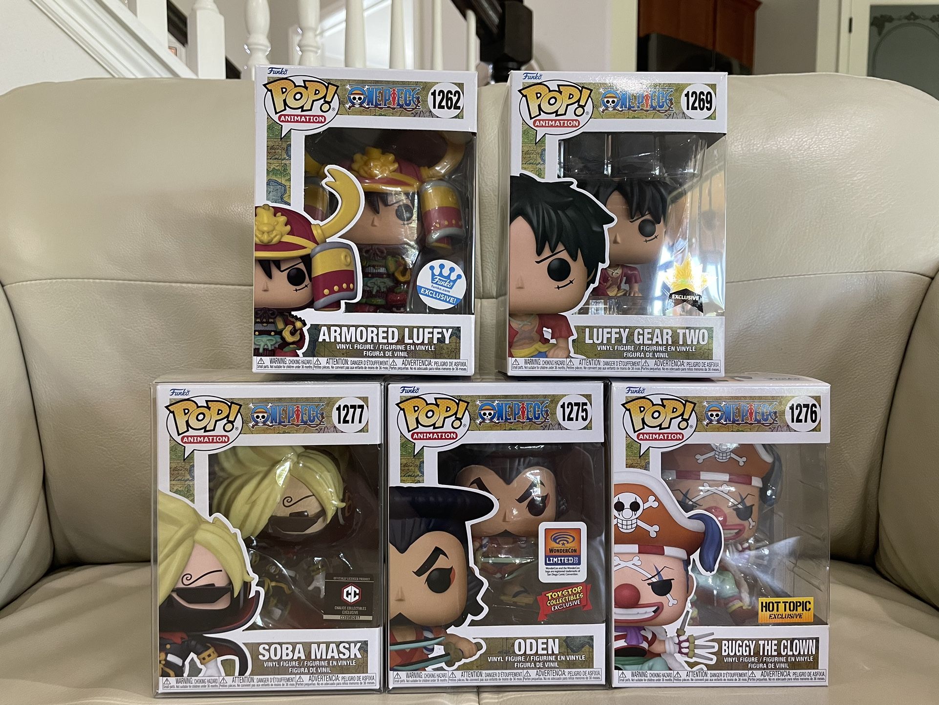 Funko Pop One Piece Buggy The Clown, Armored Luffy, Oden, Soba Mask, Luffy Gear Two - see description