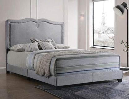 Grey Velvet Bed with Nailhead trims Queen size only Best Prices in the Industry Guaranteed! (Mattress not included) *No Tax *Pickup in Tracy by Appt *We Can Deliver