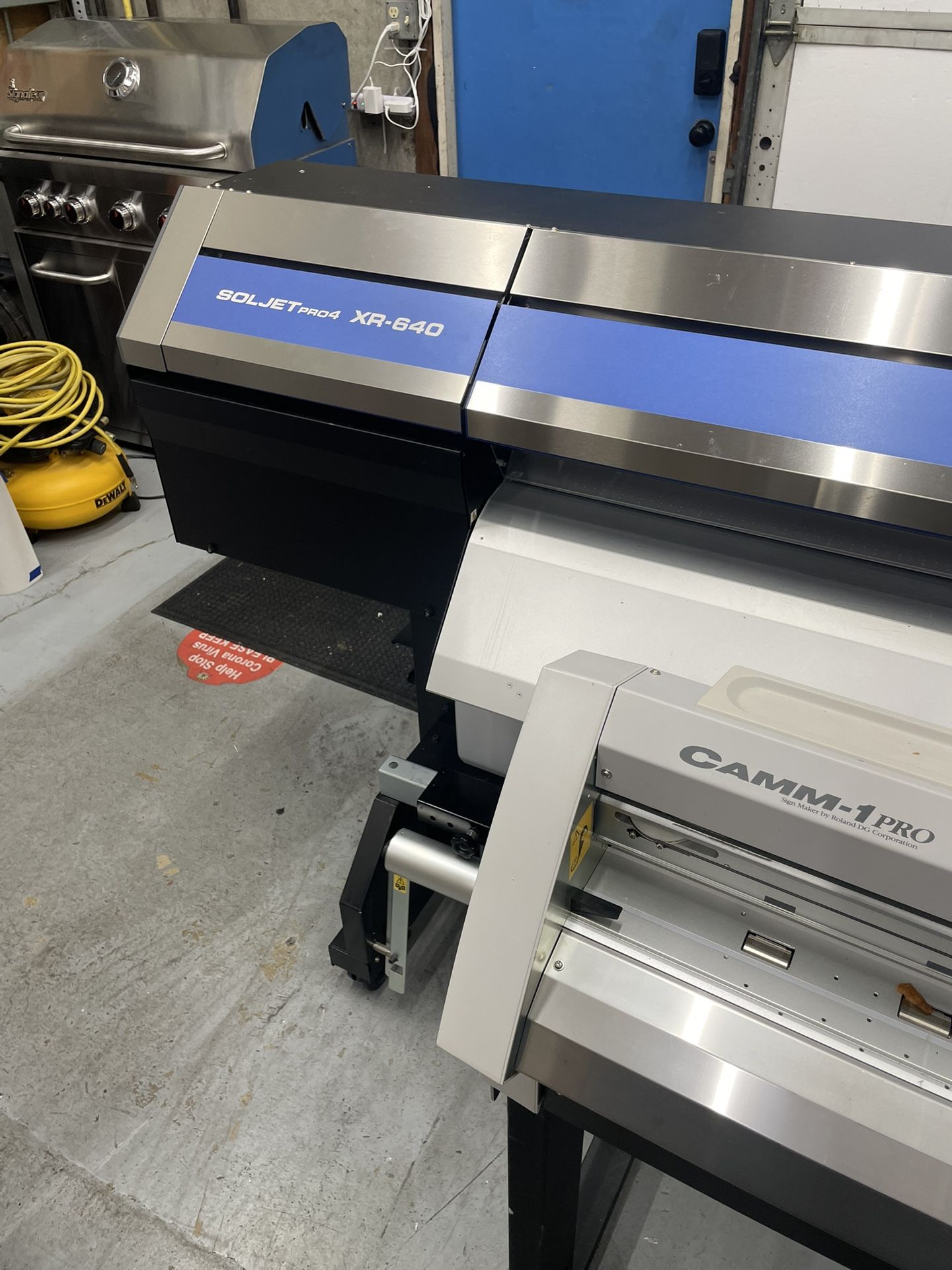 We retiring our roll media Roland XR-640 a printer. This is a workhorse printer fully functional with no issues. Printer heads have been replaced within the last ~2yrs. Included in this bundle: - 1x Roland SOLJETRpro4 XR-640 + new ink cartridges (1x LK, 1x CY, 1x LC + Cleaning Cartridge) - 1x Roland Camm-1 Pro + Extra Kiss Cut blades -1x PC with Versa software to drive printers.