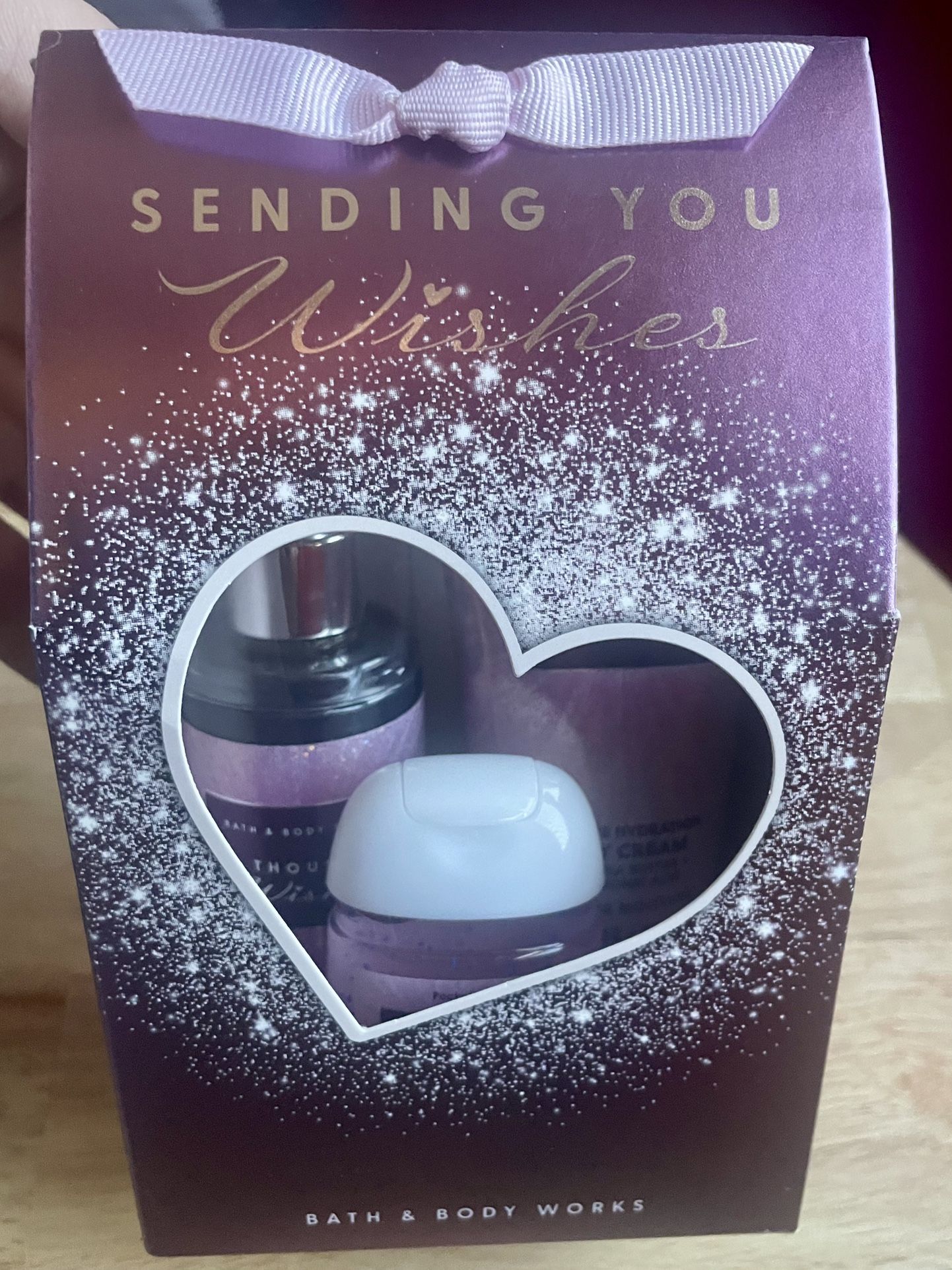 Brand new A Thousand Wishes gift set from Bath & Body Works. Comes with spray, cream, and sanitizer. Great gift for Valentine’s Day! The back has lines to personalize a message. $15 Located in Goodyear