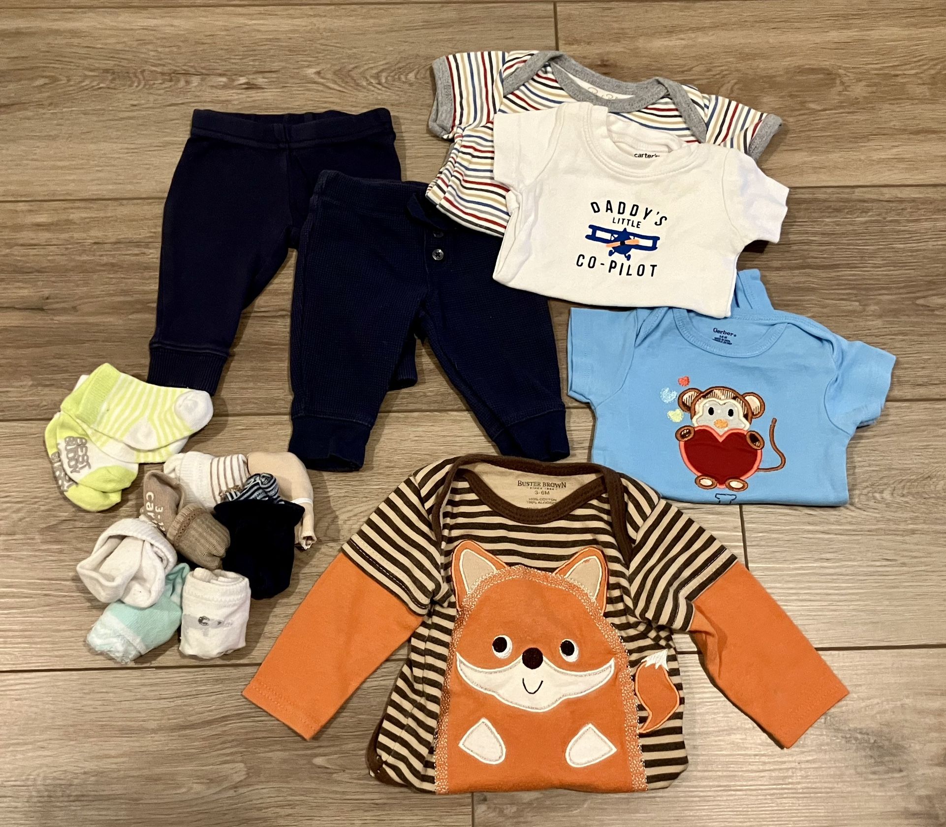 NB, mostly 0-3mo, long sleeve is 3-6mo 1 sleeper 1 SwaddleMe 4 shirts 2 pants Bunch of socks, some new with the plastic tag still on them. Pickup Harmony Grove area 92029 behind Palomar Med center