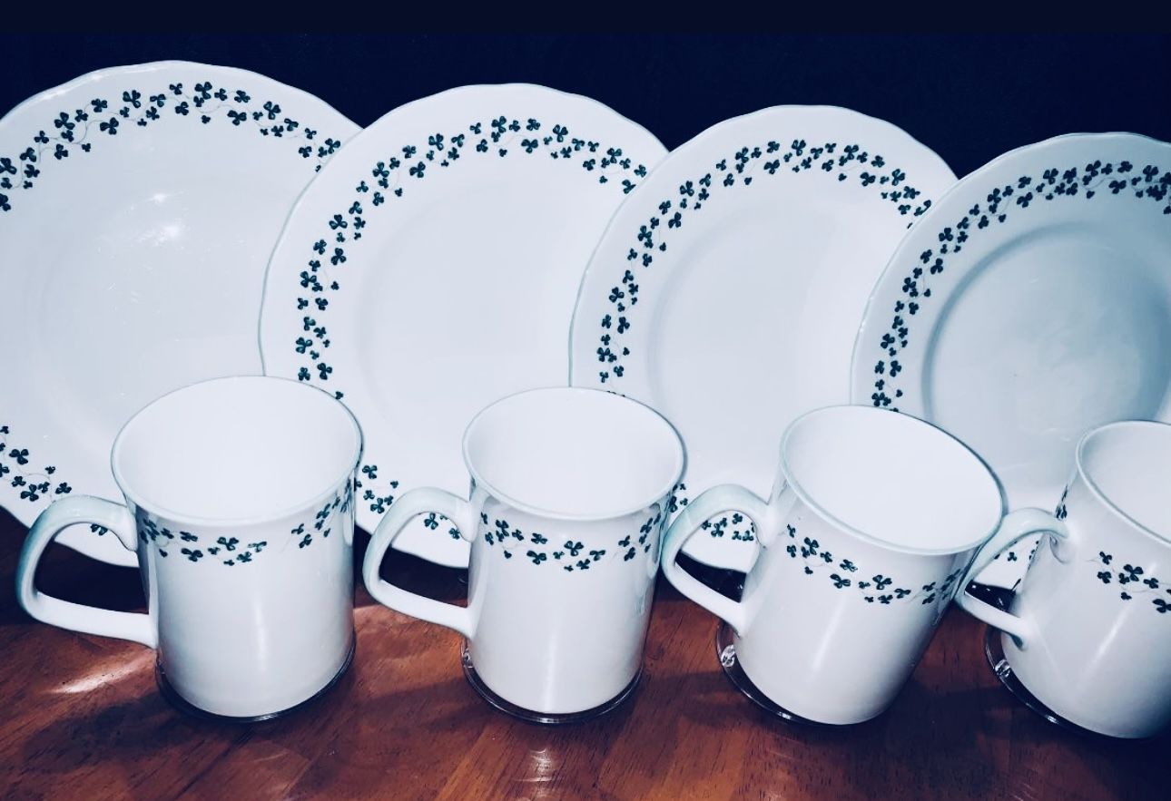 SHAMROCK BONE CHINA MUGS & DESSERT PLATES HALLMARK on Each Piece SET OF 4 (FOUR) - NEW UNUSED WHITE AND GREEN