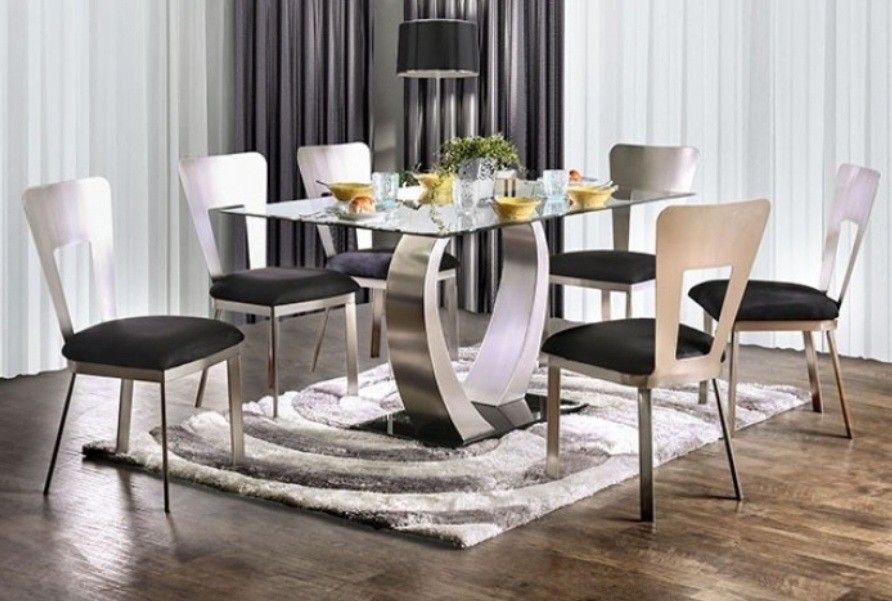 βπ« We do not have a showroom. We deliver directly from the manufacturer to your home π . π Delivery is only $40 π οΈ Assembly is an extra charge. Price on assembly depends on which item you order! π΅ We accept cash on delivery Mattresses are sold separately π₯We are voted #1 on offer up, please also view other options on our page!!! Beds, bedroom sets, sectional, sofas, daybed, futon, vanity, dining set, chairs, recliner, Loveseat, dresser, queen bed, king bed, desk, kitchen cabinets, shaker cabinet CM3728T-TABLE Graceful curves durably support the wide, rectangular glass top. The elliptical metal posts feature beautiful satin plated powder coating, matching the metal chair frames. Relax in style as the padded microfiber cushions offer comfort while the black upholstery complements the black finished base. Contemporary Silver, Black Microfiber, Metal, Tempered Glass 8Mm Tempered Glass Top Tapering Elliptical Post Table Base Black Base & Padded Microfiber Seat Metal Frames W/ Satin Plated Powder Coating Dining Table. 60"L X 36"W X 30"H