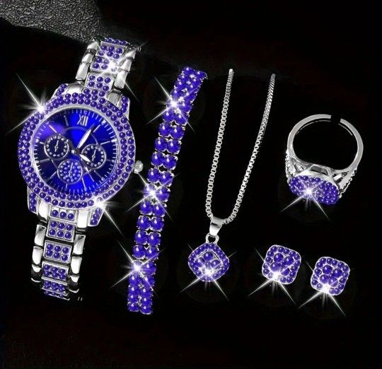 6pcs Blue Rhinestone Quartz Wrist Watch with Bracelet Necklace Earrings Ring Set