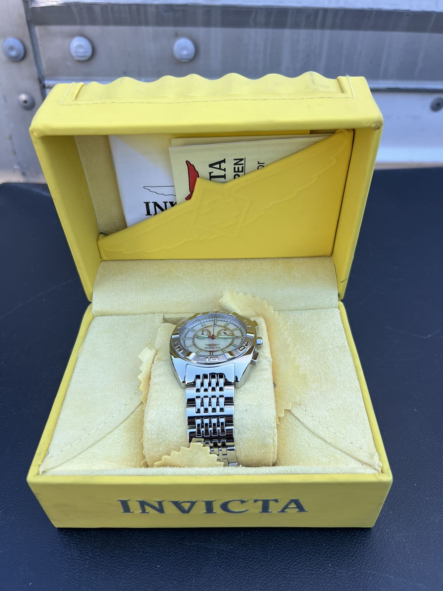 Invicta model 3703 men’s chronograph-style watch featuring stainless steel case and bracelet with silver dial and subdials. Quartz movement with water resistance and sapphire crystal. Includes original Invicta box and paperwork. Clean condition with minimal wear. Great everyday statement watch.