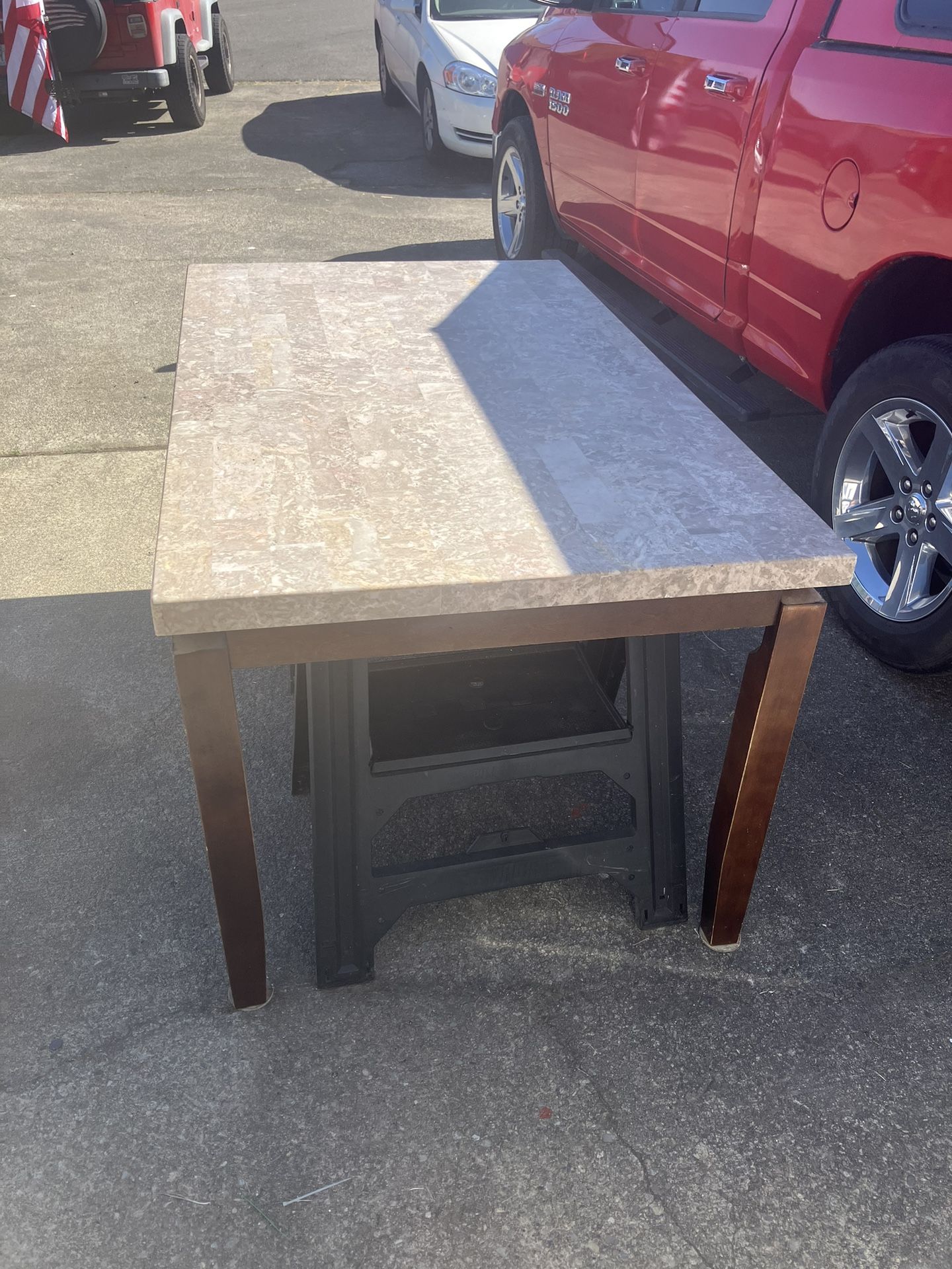 In excellent shape. This thing is HEAVY and sturyd. Made up of a genuine marble top with real wood. This is not cheap furniture. From a non-smoking, pet free, responsible adult home. Delivery is available with a reasonable fee within a REASONABLE distance. Must have help on your end to unload upon delivery. 64” x 38” x 30”