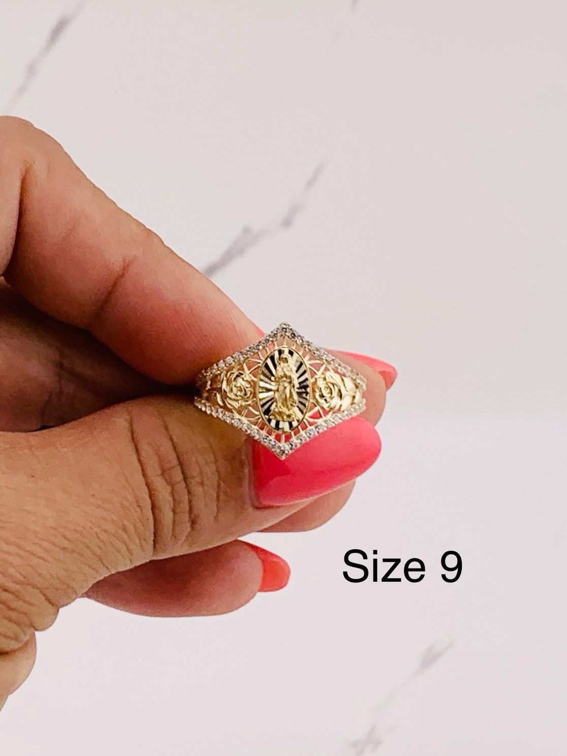 10k gold ring Virgin Mary - Our lady of Guadalupe ❤️ Yellow Gold authentic with white cubic zirconia ❤️ Size 9 ❤️ Fine Jewelry Check out my other jewelry ************ ❤️ Anillo de la Virgen María - Nuestra Señora de Guadalupe de 10 Kilates oro sólido ❤️ Tamaño 9 ❤️ Anillo para mujer ❤️ Joyeria fina ❤️ Oro dorado autentico ❤️ Anillo La Virgen de Guadalupe Stock #081824