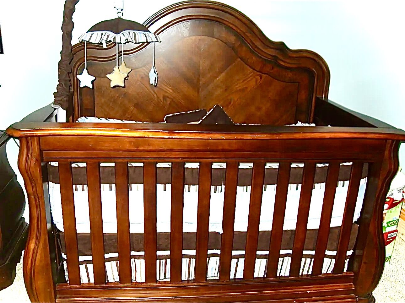 European Baby Crib + Drawer + Night Stand + Bedding & Accessories Solid wood, very heavy. Originally paid over $1,800 + $120 Bedding & Accessories