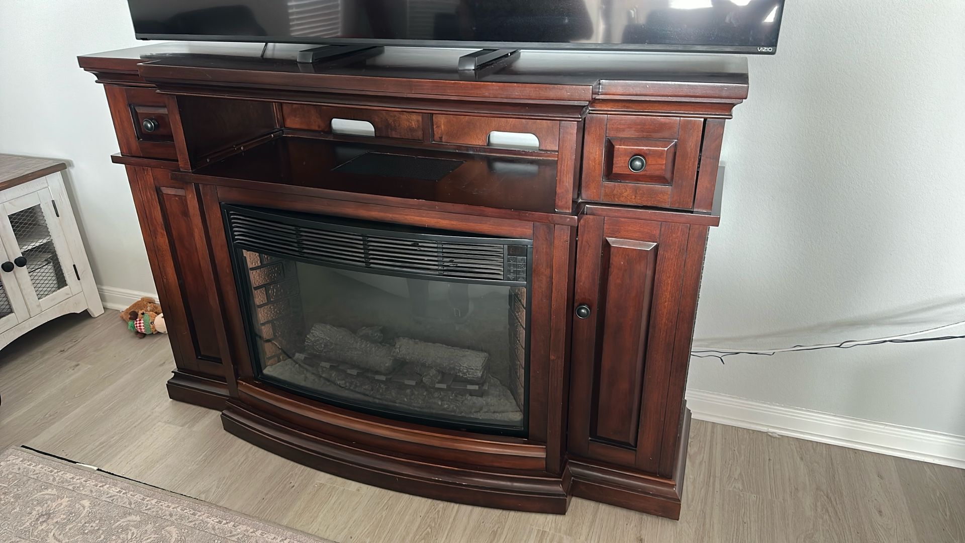 Used electric fireplace. Cherry wood finish with built in storage on each side and two drawers. Comes with remote control. In working condition uses 120v electricity.