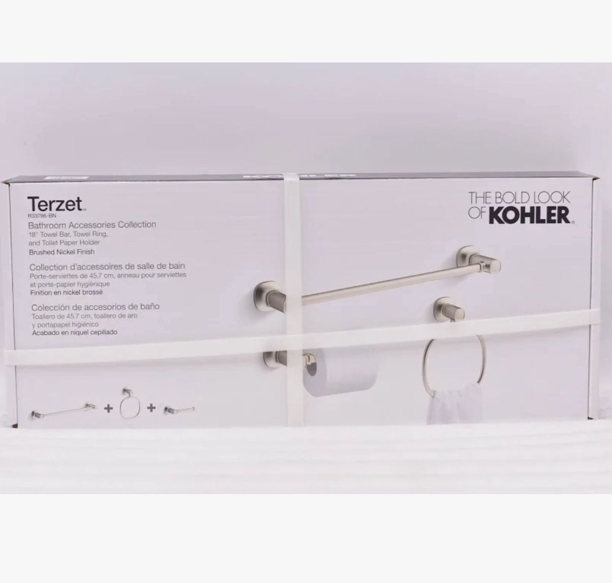 Brand-new, never opened box Kohler Terzet three-piece bathroom accessory set in a modern brushed brass finish. This coordinated set includes a towel bar, towel ring, and toilet paper holder — perfect for upgrading your bathroom with stylish, high-quality hardware. The premium metal construction and Kohler’s durable finish resist corrosion and tarnishing, adding both functionality and elegance to your space. Installation is simple with all hardware and templates included.  ✨ Highlights: • Elegant Modern Brass finish — warm, contemporary look • Complete 3-piece set: towel bar, towel ring, toilet paper holder • Premium metal construction for long-lasting durability • Easy wall-mount installation with included hardware & templates • Perfect match with Kohler faucets/fixtures or other brass accents
