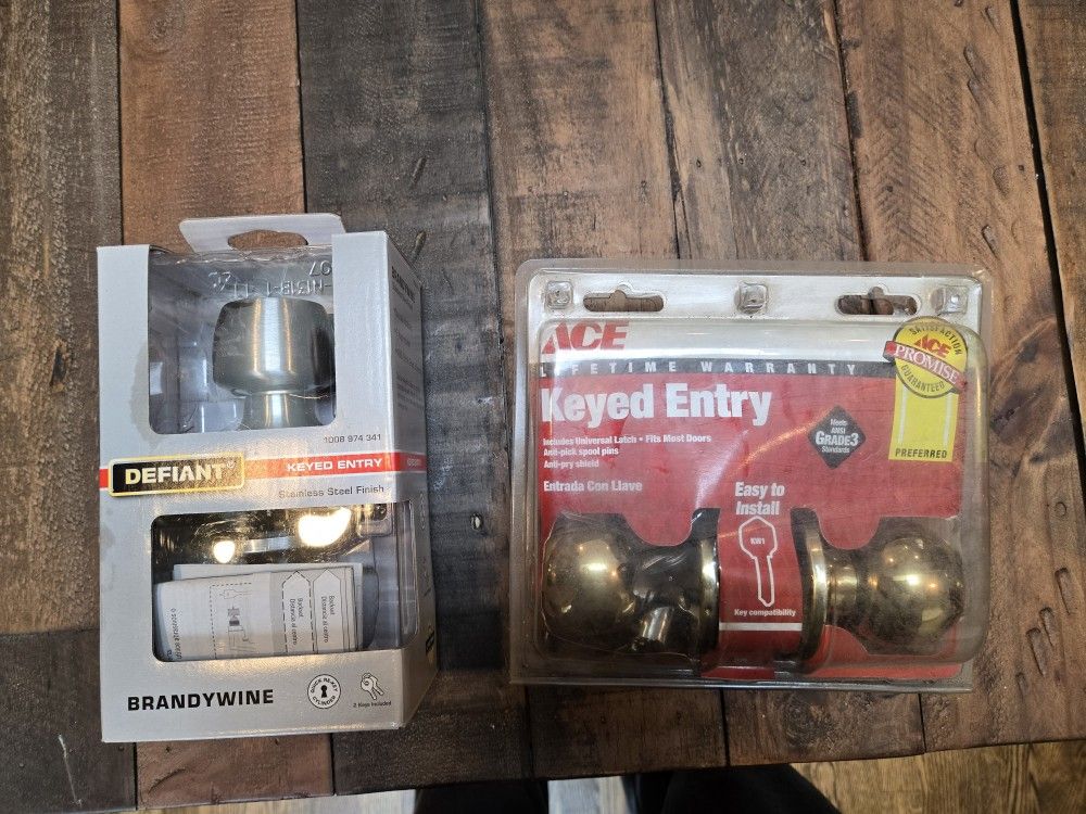 Btqnd new Defiant Brandywine Stainless Keyed Entry Door Knob & Ace Brass Keyed Entry Door Knob. Comes with keys. Selling both together. If listed, it's available (please don't ask). Cash only. Please click for other items I'm selling. Bundle pricing.