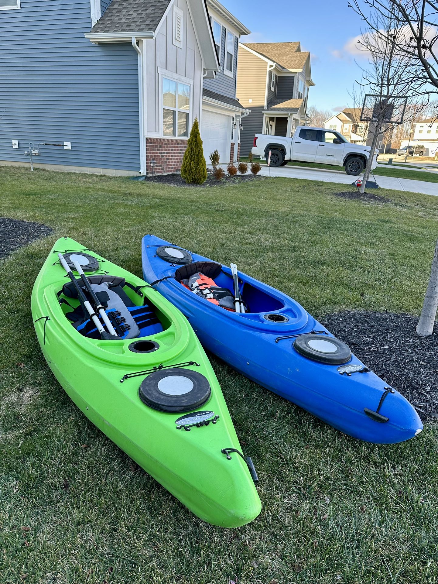 Lightly used Future beach kayak set. The model is Mariner 10.4, 10 ft in length and each includes a paddle and life jacket. Message me with any questions, pick up in Pendleton or we may be able to work out delivery.