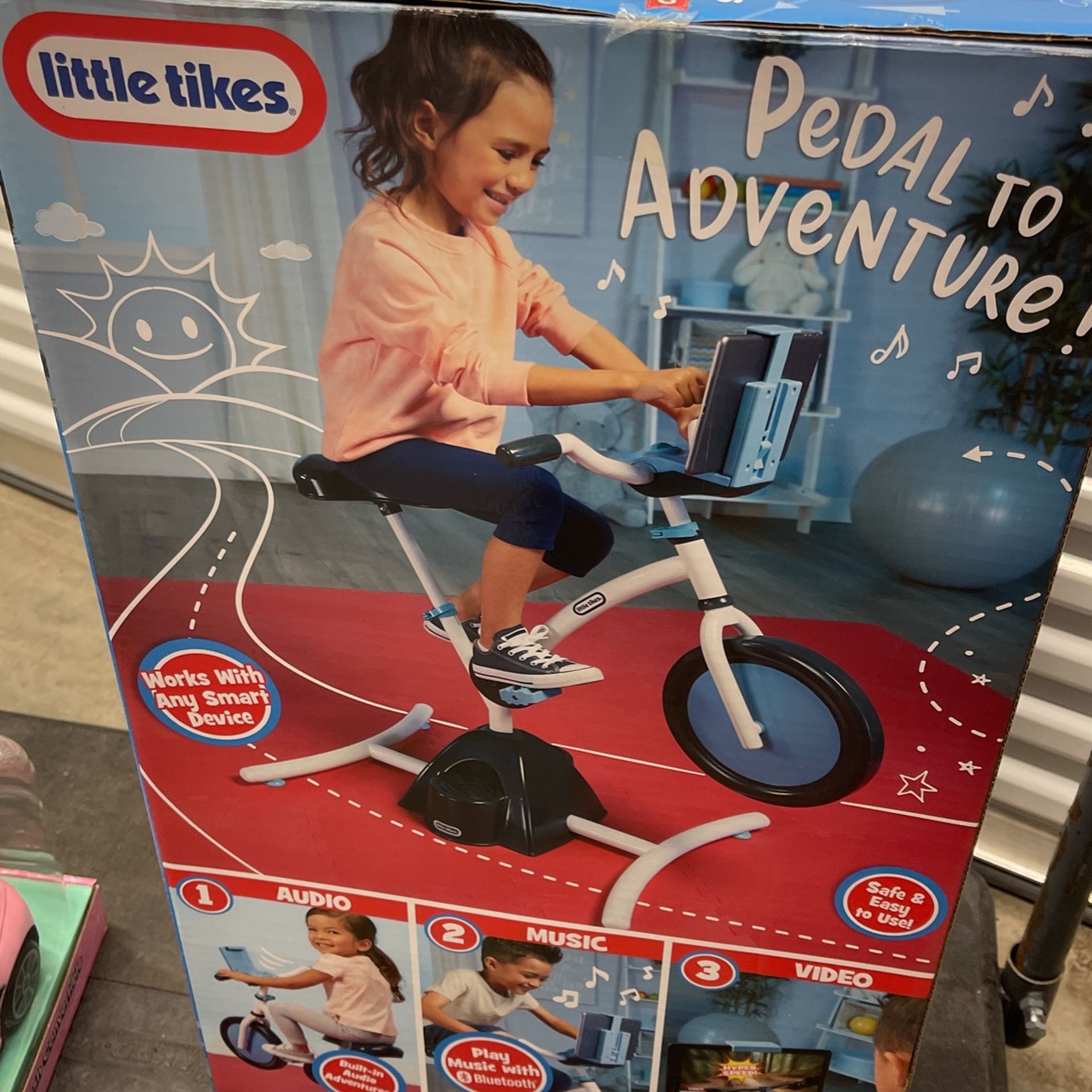 • FREE TRAINER ADVENTURE VIDEOS – Easy to access videos on YouTube for a fun visual adventure. • BUILT-IN AUDIO ADVENTURES – Excitement right out of the box so you can ride without a screen. • ADJUSTABLE SEATING & HANDLEBARS – Fits kids of all sizes. • ADJUTABLE RESISTANCE – Always kid-friendly, but adjust the lever for an easy or challenging workout. • TILTS FOR EXCITEMENT – The bike safely tilts back and forth for more thrills. • ADJUSTABLE MOUNT FOR SMART DEVICES – Mount and use your own smart device. • DESIGNED FOR SAFETY – The coil spring mechanism, heavy-duty metal frame and textured grip handlebars for a safe ride. • Ages 3-7 Years