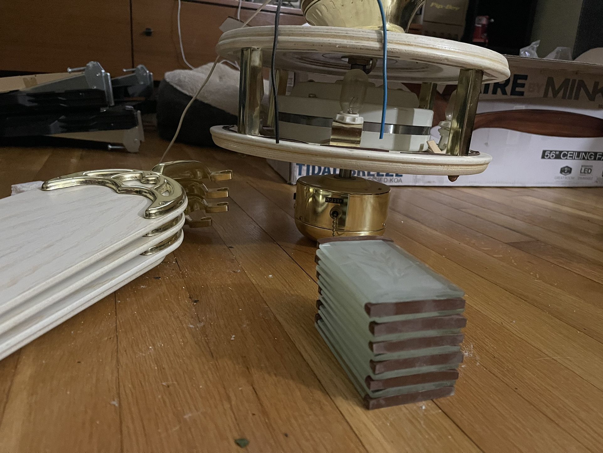 Works perfectly I just replaced it for one that got my living room better. All lights and the fan works. Comes with everything needed to mount it to your junction box. Pics show the glass pieces removed they are all present I removed them to prevent any damage.