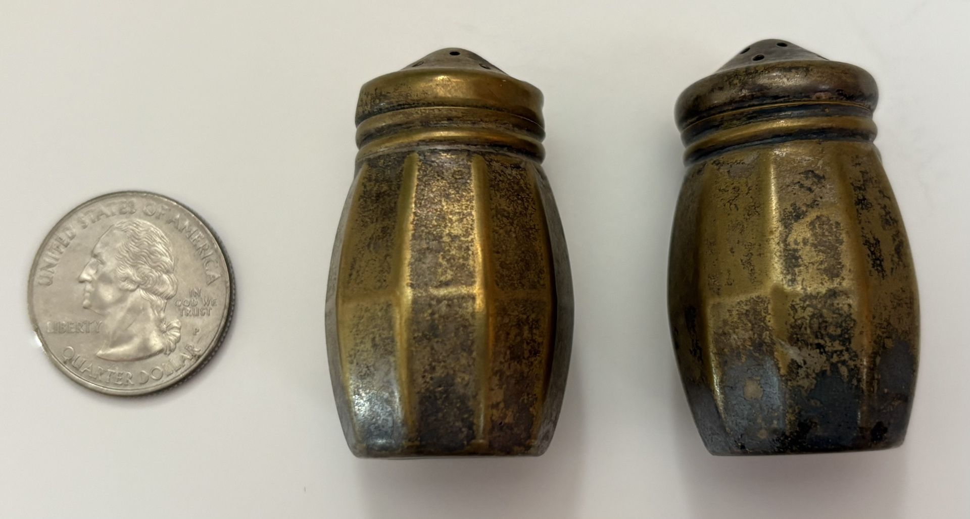 This is a set of vintage, silver-plated miniature salt and pepper shakers, likely from the early 1900s to 1950s. The shakers are approximately 2 inches tall. They were made by manufacturers Wm. A. Rogers. $10 for both Pick up in St. Petersburg