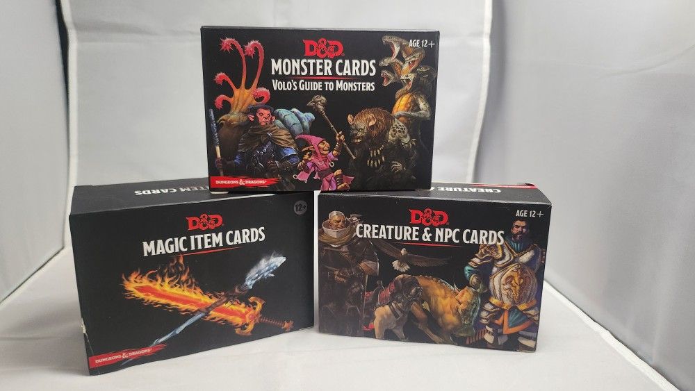 Bundle of 3 boxes of D&D 5E game cards. Creature & NPC cards Magic Item Cards Monster Cards The two smaller boxes retail for 19.99 each and the larger retails for 29.99 Bundle deal basically gives you the largest set for free! Never used in game, just thumbed through. Smoke free, pet friendly home.