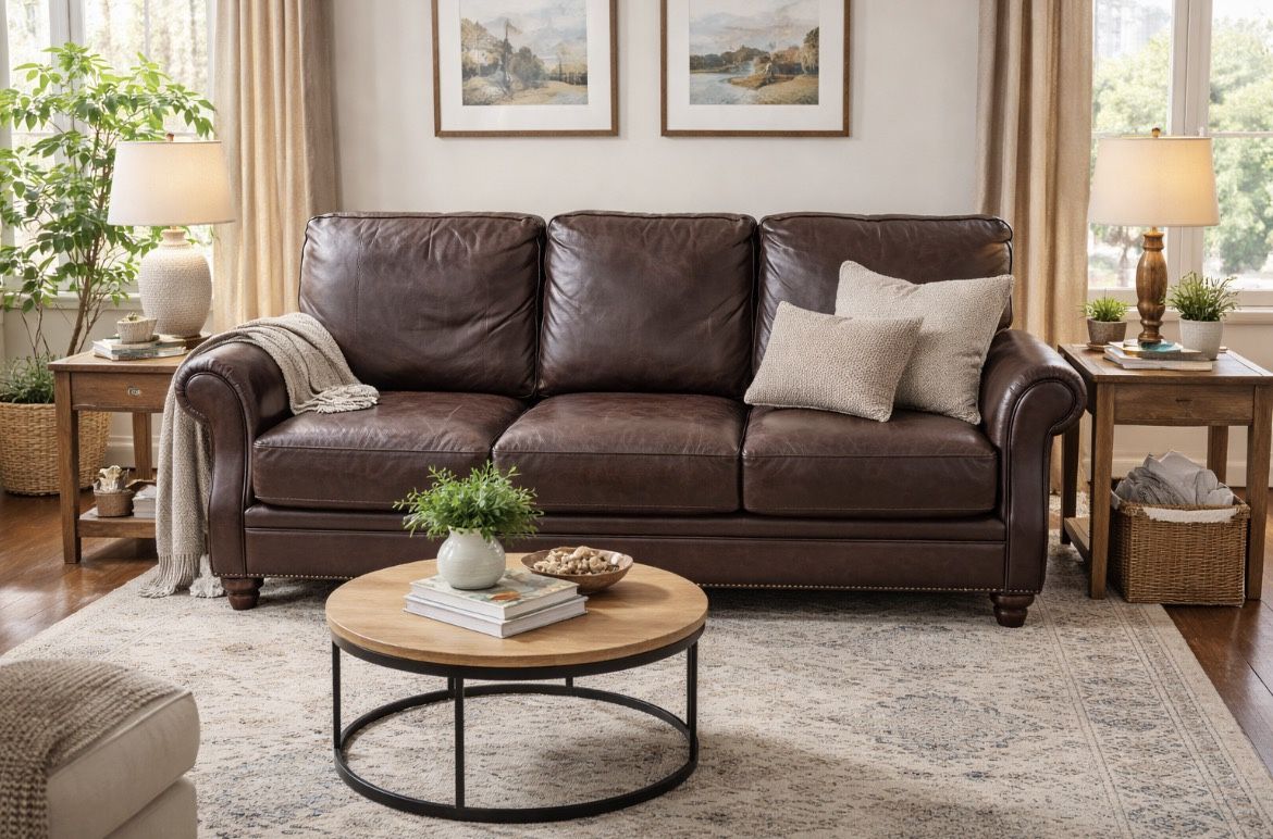 beautiful brown soft leather all around sofa. compliments any space. supreme comfort coiled cushions. 6'-9" in length 3'-3" wide