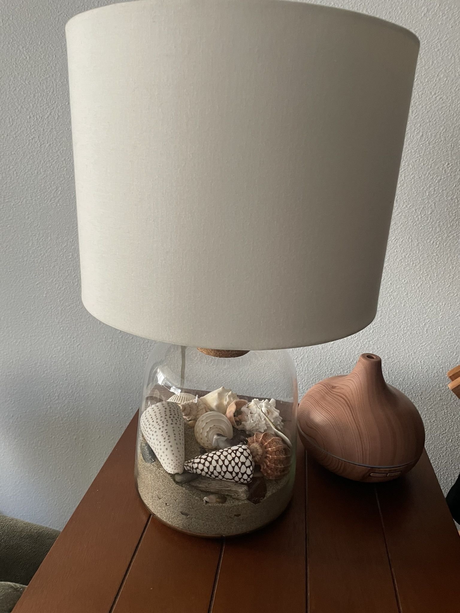 Pottery Barn lamp. 20 1/2” to the top of the finial. Top comes off and you can put whatever, or nothing, inside. Currently has my daughter’s shells and sea creatures in it, which I was planning on removing.