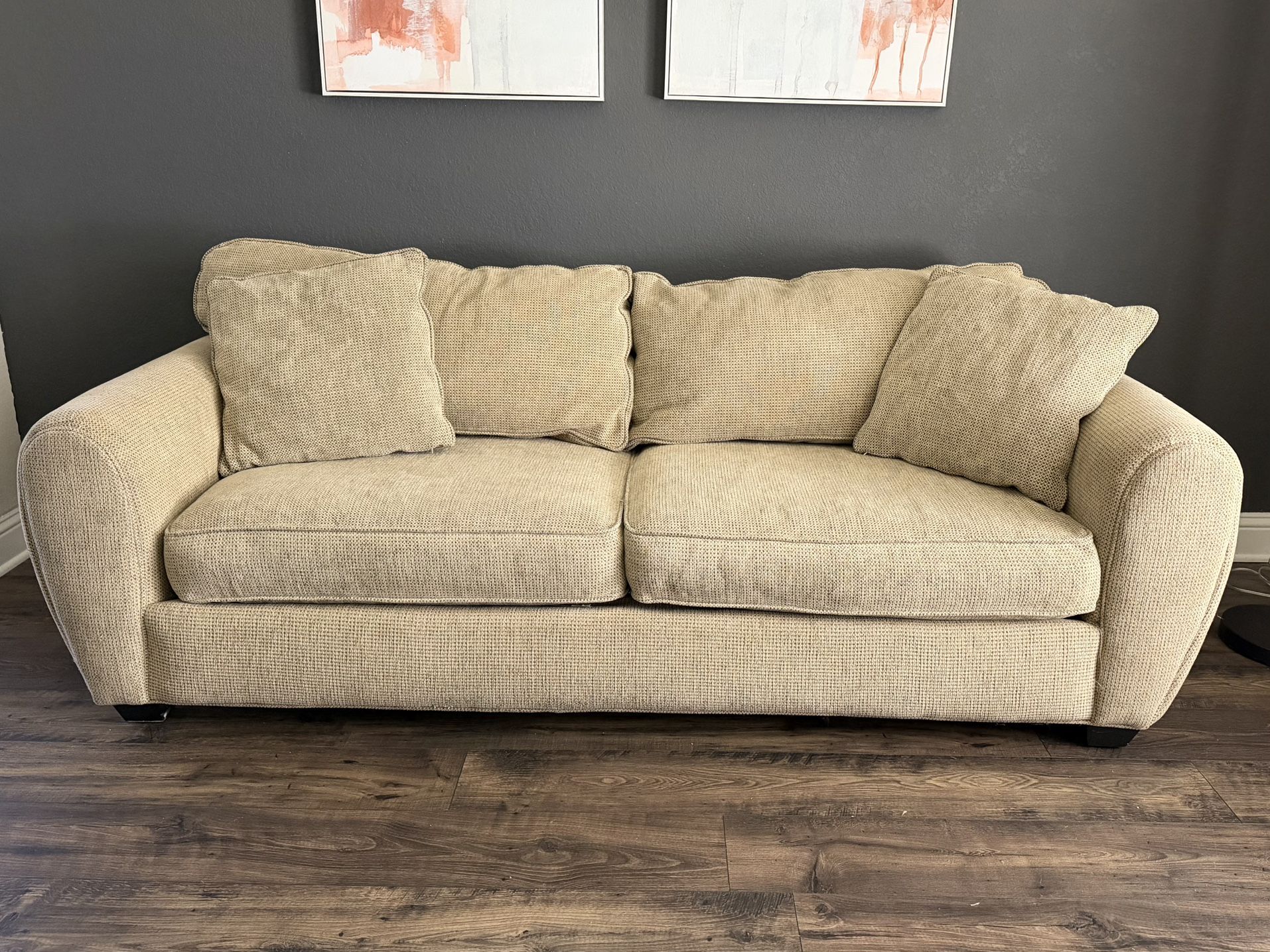 DO NOT ASK IF IT’S AVAILABLE. WILL NOT RESPOND. IF THE LISTING IS UP, IT’S AVAILABLE. Beautiful dark tan/beige sofa in excellent condition. Very comfy. No stains, rips, pets or smoke. Dimensions are: Length 84 , width 36 & height 30 Will deliver for a fee depending on distance.