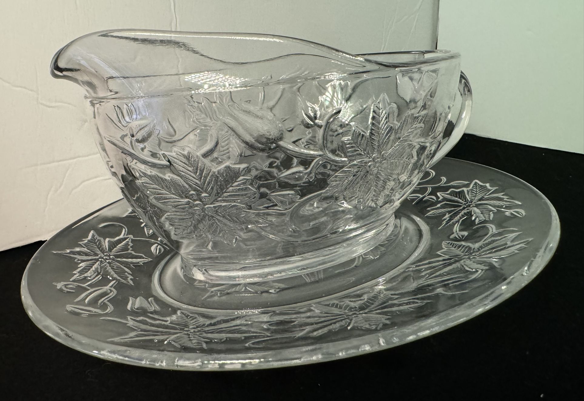 Princess House “Fantasia Poinsettia” crystal gravy boat with matching underplate