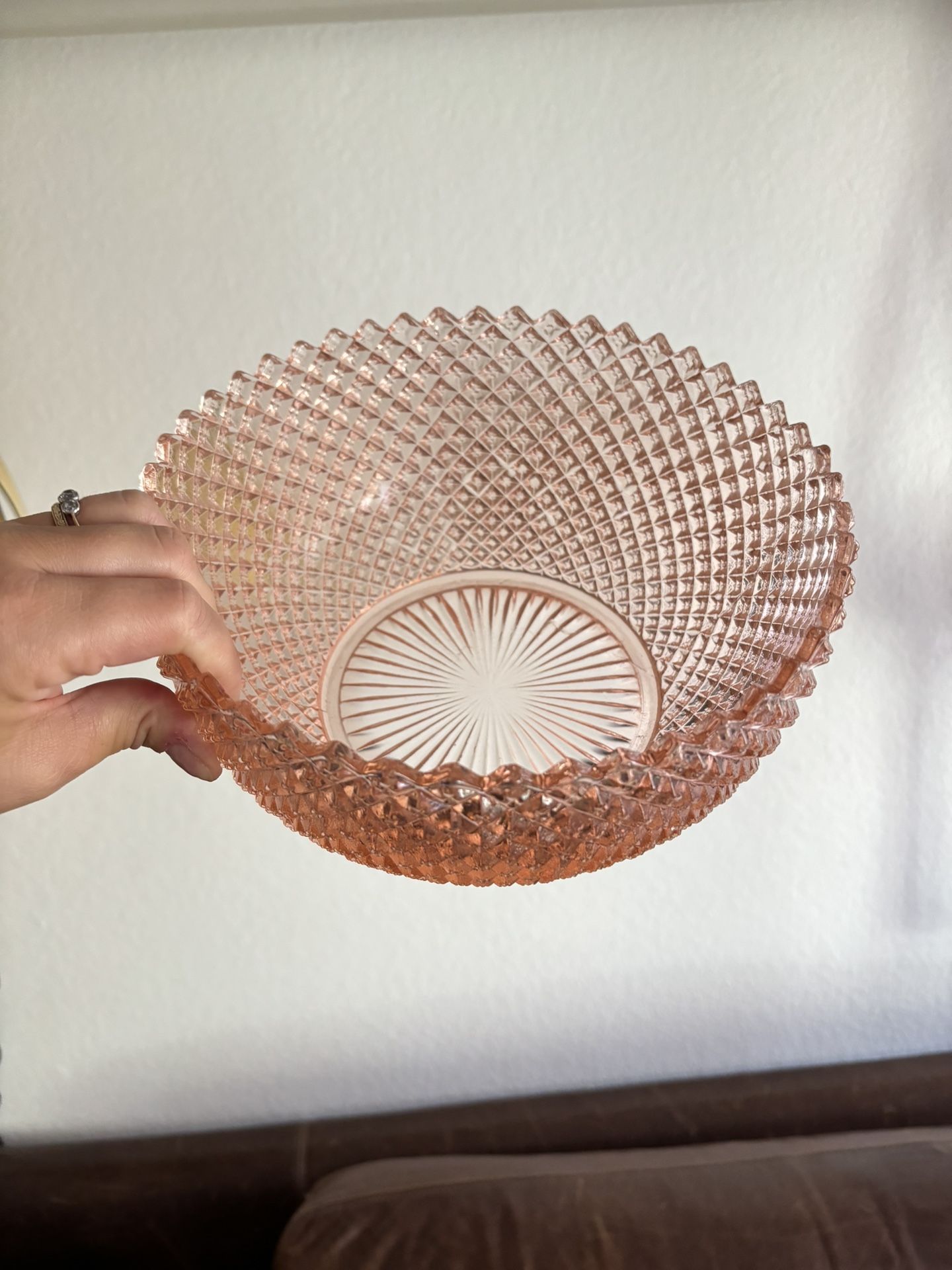 I think old anchor hocking brand, textured diamond pattern through out with smooth inside. Very thick quality sturdy serving bowl. First come first serve, cash only please