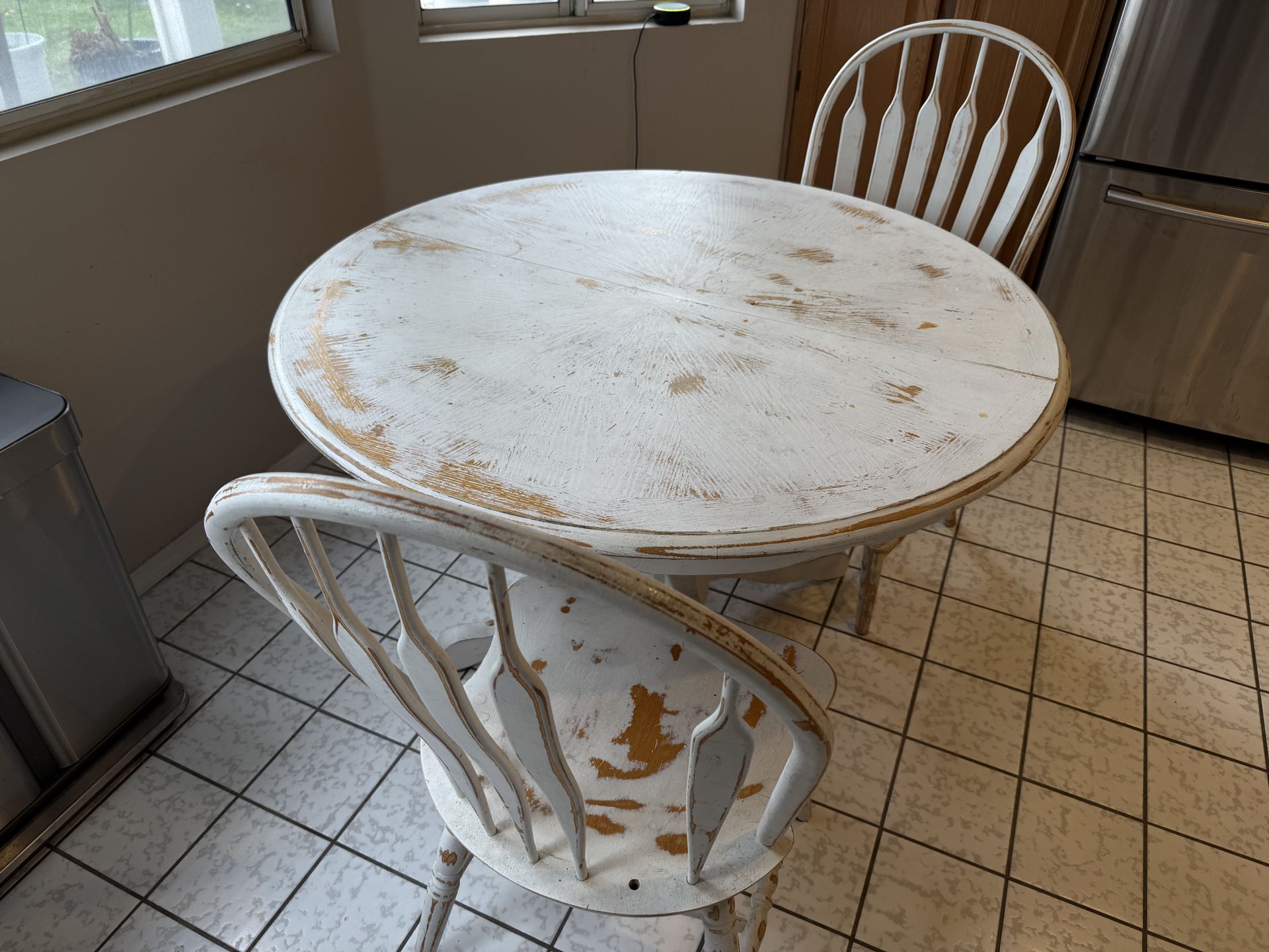 48 inches round. 30 inches tall. Two chairs need to be refurbished