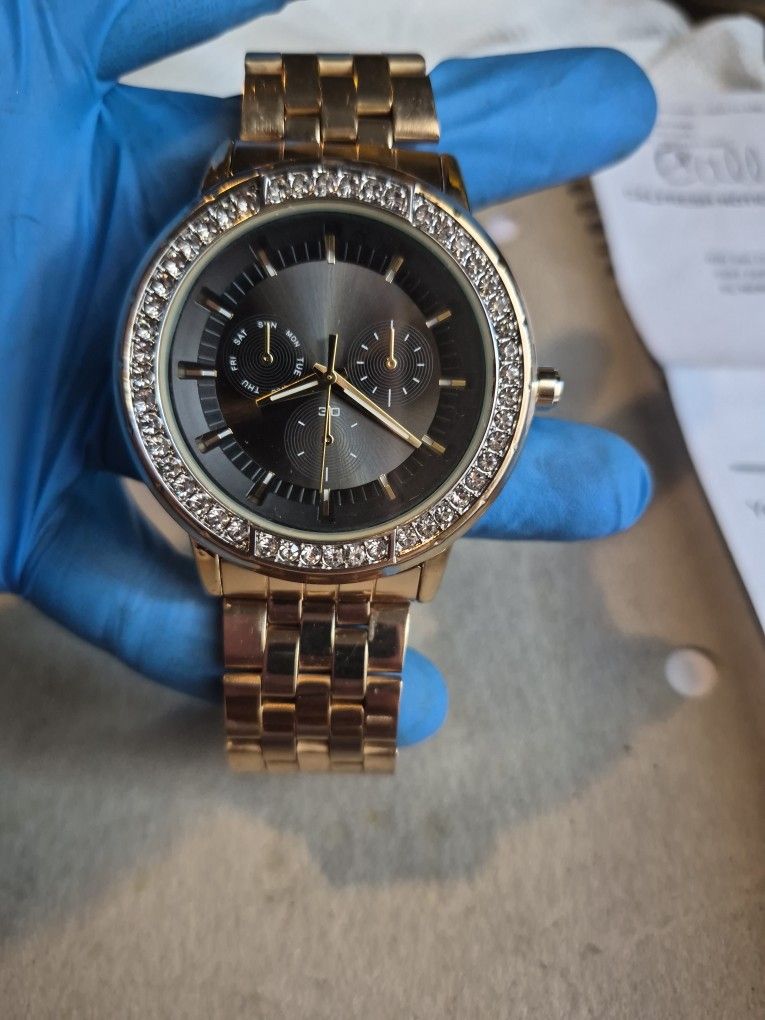 Dress it up to Elegant watch. Or dress it down, Mens Stone Black Dial Gold Finish Fashion Dressed to Impress Casual,Hip Hop Watch. New w/o box. Hour , minute and second hand. stainless steel Case Back. Will fit all wrists up to 7.5" and Removable Links. Quartz Movement. OBO
