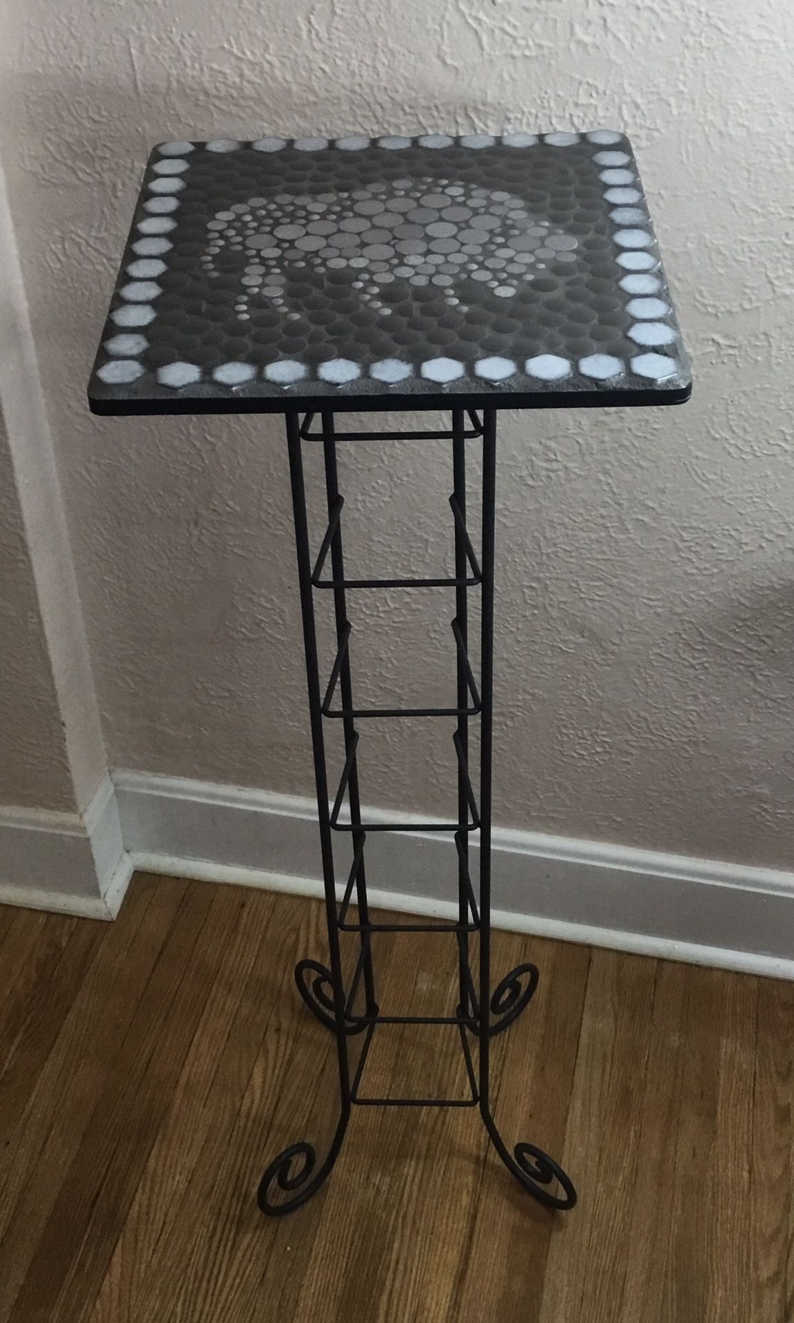 Here’s a great plant stand for trailing plants The buffalo top has “penny round “ tiles and sealed for durability Metal base Measures 13 inches wide m 13 inches deep and 39 inches tall Available in our booth downstairs at The Old Chapel Antiques, 172 Robinson in N . Tonawanda Credit cards accepted.