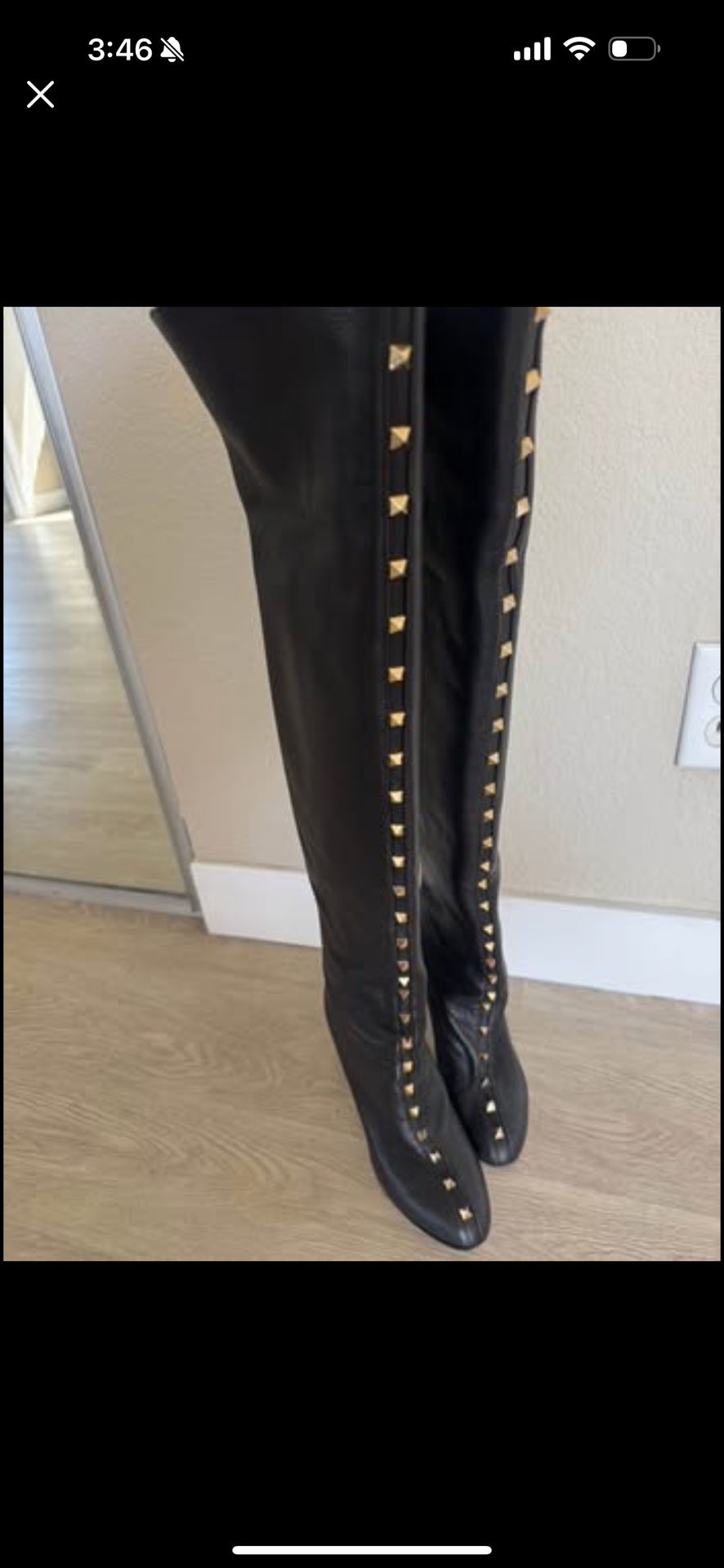 Authentic Valentino boots crafted from premium black leather. Chic over-the-knee design with a sleek stiletto heel that elongates the legs. Embellished with the iconic gold Rockstud details, giving them a timeless and sophisticated edge. • Color: Black with gold studs • Material: 100% genuine leather • Heel height: approx. 9 cm / 3.5 in • Classic, elegant, and versatile • Excellent condition 🖤 Perfect for elevating both daytime and evening looks. Original retail price: $2,000+ USD 📦 Clean and ready to wear.
