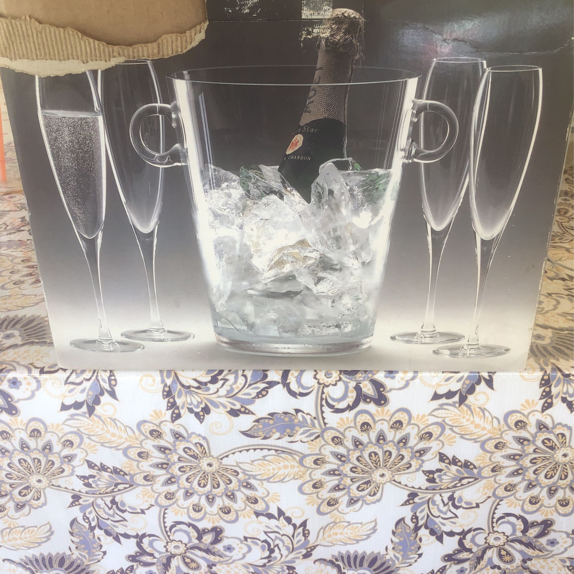 Have a new large Glass ice Bucket with 4 Fluted champagne glasses,